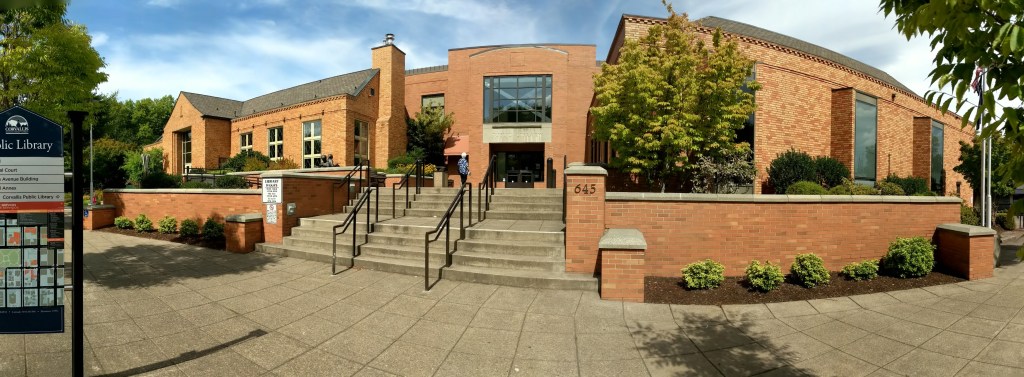 Panoramic view of the front entrace to the public Library in Corvallis.