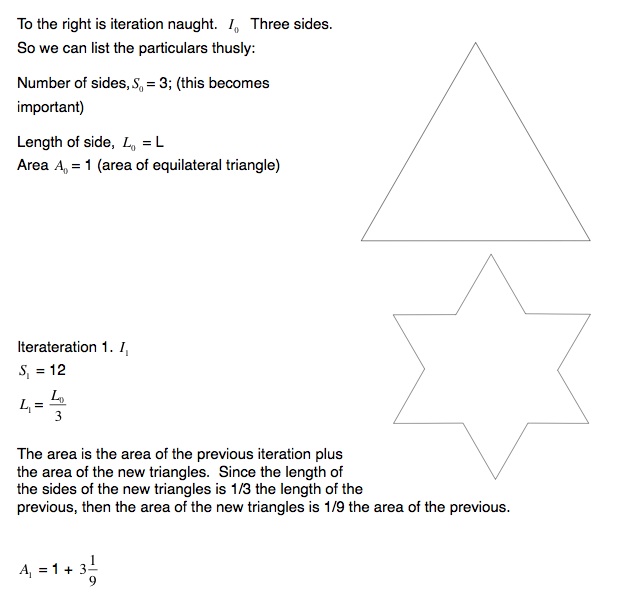 It is possible to increase the area of a regular triangle by placing smaller regular triangles on the middle thirds of its three sides. By so doing, you obtain a six-pointed star. The process can continue indefinitely. At each step, a smaller regular triangle is placed on the middle third of all the line segmens on the perimeter of the figure obtained from the previous step. Sketching the shapes obtained for the first few steps of this process is an interesting way to spend a few moments.