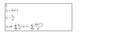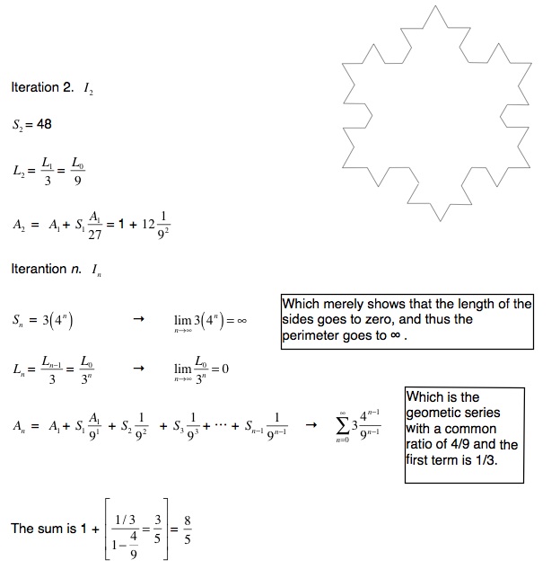 So, it sums out to 6/15. Just over a third of the original area. Still an infinite perimeter.